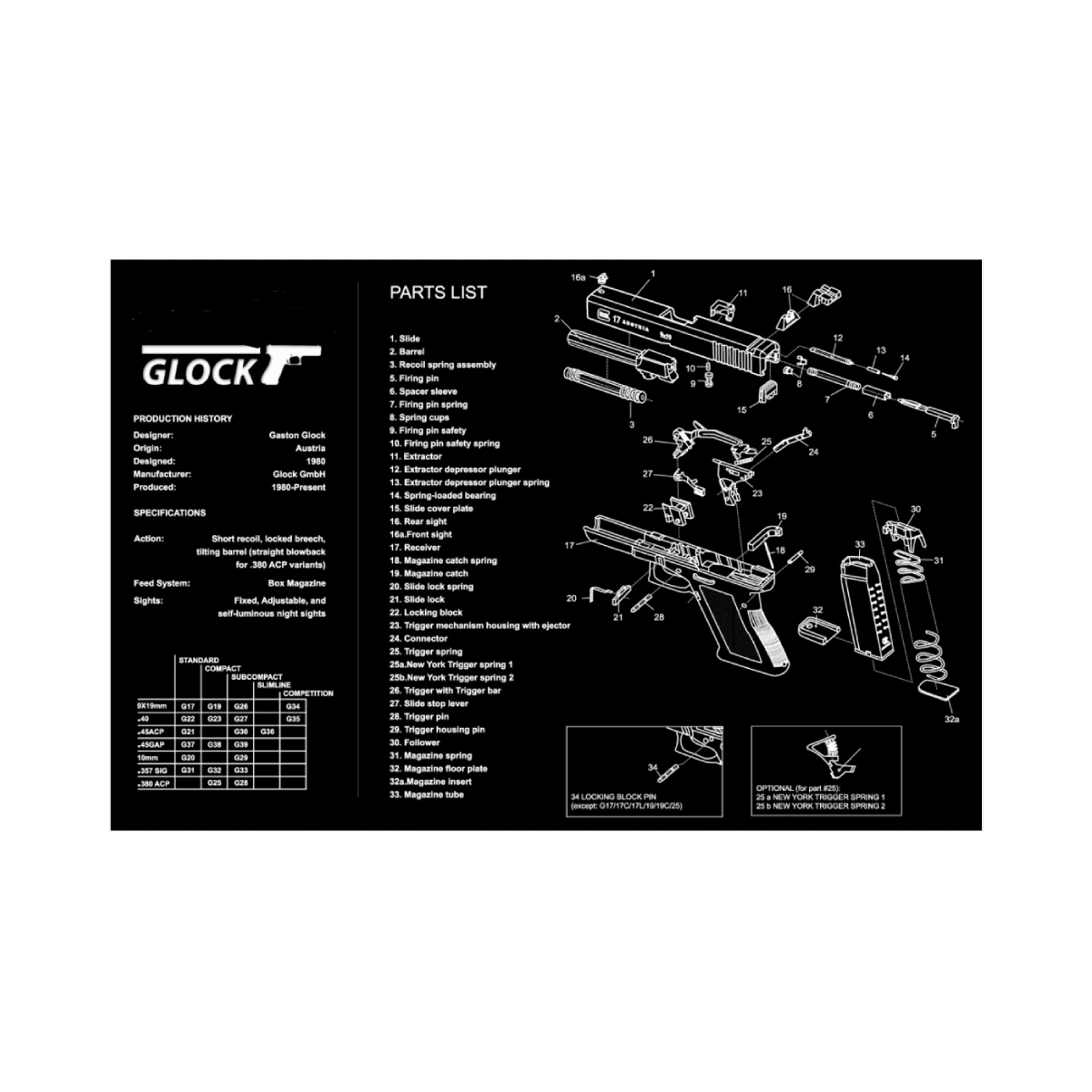 המשטח כולל תרשים פירוק מלא של אקדח Glock.